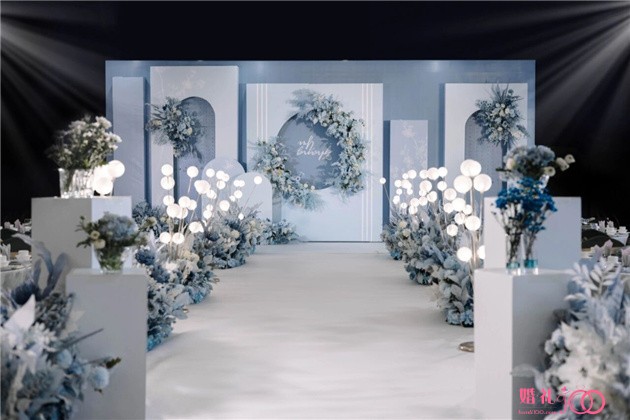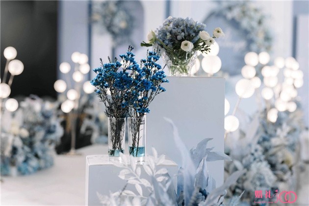 浅色梵高蓝婚礼。整体布置颜色采用白、蓝、灰三色调和过度色,远看皆为蓝近看各不同,由浅入深,又由蘩化简。就如爱情般跌宕起伏终会归于美丽的回忆。花艺采用真假结合,从观众视角看远处的假花丰盈饱满,近处的鲜花锦上添花。每一处场景均为一副对色彩执迷不悟的画作。更显直率而又单纯。就像你对她的简单爱一样。